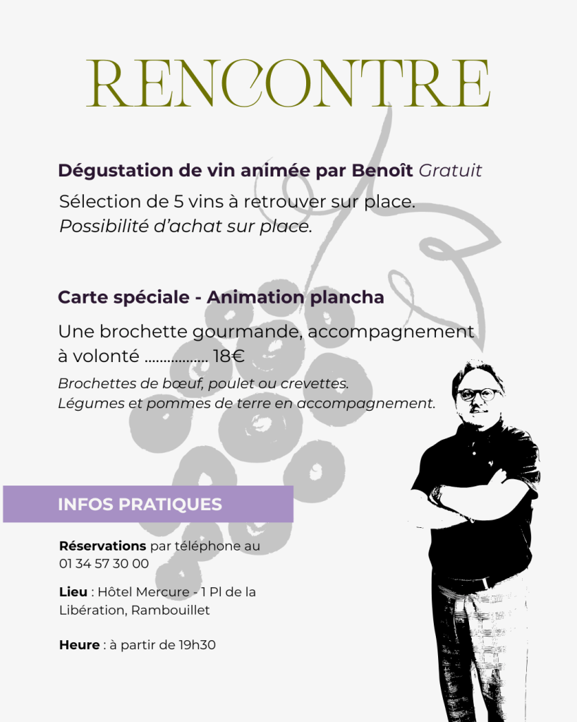 Samedi 5 juillet 2025 à partir de 19h30, retrouvez Benoît Rousseau pour une dégustation de vins suivie d’un repas spécial plancha !